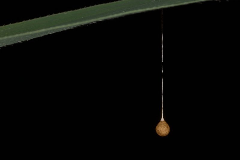We kwamen veel cocons tegen van het Moeraspareltje (Theridiosoma gemmosum). Dit spinnetje maakt een horizontaal wielweb laag bij de grond dat het met een hulplijn strak trekt (zie tekening in Spinnengids pp. 70). | ![]() |